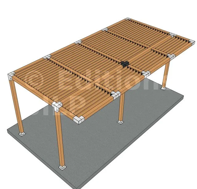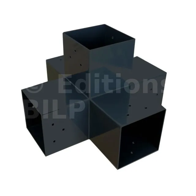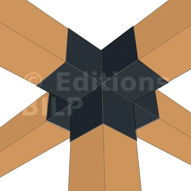 Il permet de raccorder deux poutres 120x120mm perpendiculairement à une autre poutre 120x120mm, le tout étant supporté par un poteau vertical de 120x120mm.