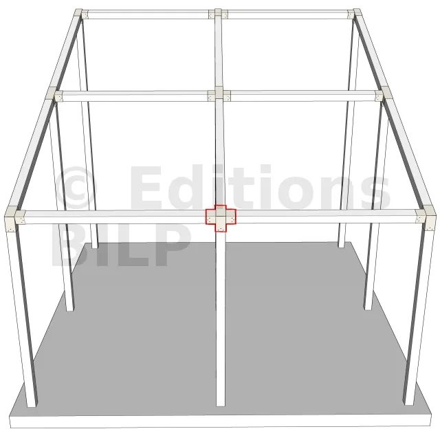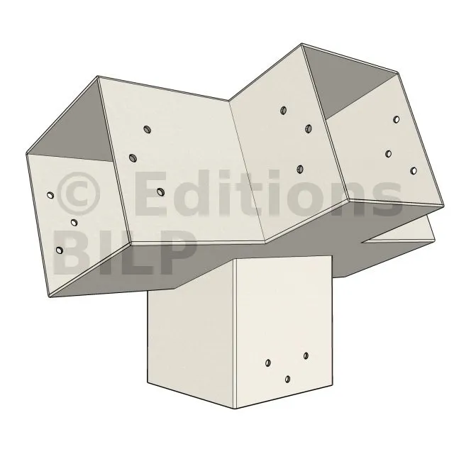 Connecteur d’angle intérieur à quatre directions conçu pour l’assemblage de poutres en section 120x120 mm avec un chevron de même section incliné à 20°. Il assure la jonction structurelle entre les éléments horizontaux, le chevron incliné et un poteau porteur vertical en 120x120 mm.