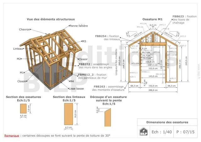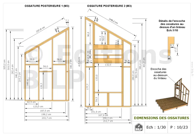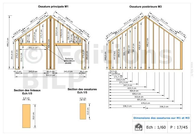 Les plans de structure à l’échelle sont faciles à lire et à comprendre. Ils vous permettrons de réaliser vous-même la structure de votre cabane. Les détails de réalisation sont indiqués. Nous calculons et optimisons les dimensions et les sections de pièces de bois.