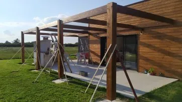 Autre point très important, votre construction doit être convenablement dimensionnée (sections et dimensions des éléments) selon la norme EUROCODE 5. Il y a de nombreux calculs à faire. Si vous surdimensionnez, vous allez dépenser de l’argent inutilement et obtenir un résultat esthétique de type "blockhaus". Si vous sous-dimensionnez, vous risquez de vous prendre la toiture sur la tête, blesser gravement quelqu’un (ou pire) et votre responsabilité serait engagée. Il faut dimensionner la structure selon les normes et les règles de l’art.