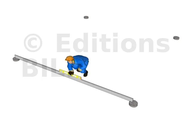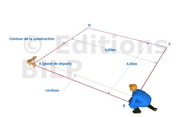 Marquer sur le sol le contour de la construction. Prendre un point A de départ et reporter la longueur de deux poutres en traçant une ligne droite à l’aide d’un cordeau (soit 4,00 m)et on obtient le deuxième point (point B). Prendre ensuite le troisième point (point C) avec une distance de 4,00 m et parfaitement perpendiculaire à la droite "AB", aidez-vous avec une équerre pour obtenir l’angle droit recherché, ou utiliser la méthode 3-4-5. Enfin, tracer une droite parallèle et de même longueur que "AB" (soit 4,00 m de long) pour obtenir le dernier point (point D) et comme vérification, regarder que la distance entre le point A et D est bien de 4,00 m. Puis fixer les pieds de poteaux à l’aide de chevilles. Fixer un pied à chaque coin du tracé et un autre sur chacune des axes des droites "AB" et "CD". Si vous avez déjà une dalle en béton comme surface d’assise, vous pouvez fixer directement les pieds de poteaux.