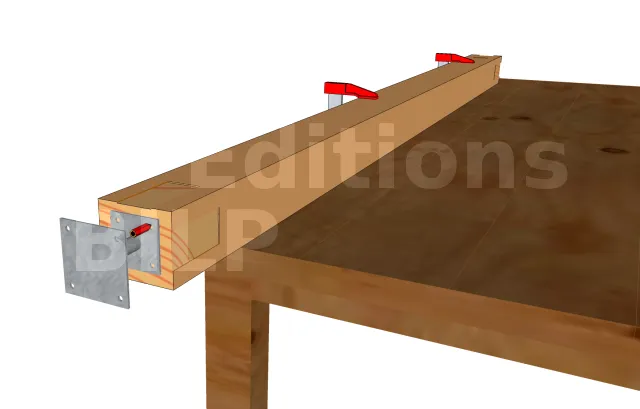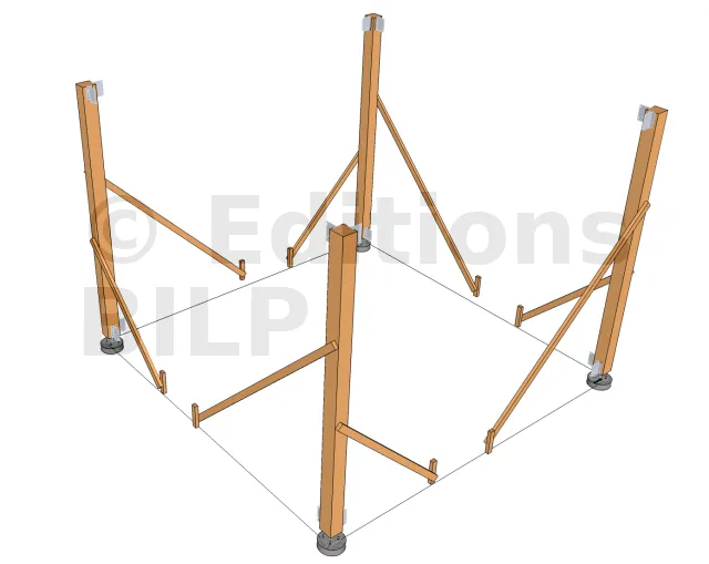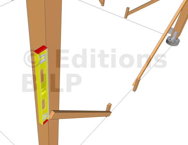 Poser les poteaux sur les plots, assurez-vous qu’ils soient bien droit, pour cela, n’hésiter pas à utiliser des tasseaux de calage, ensuite, vérifier sa verticalité à l’aide d’un niveau avant de le fixer totalement.