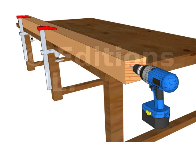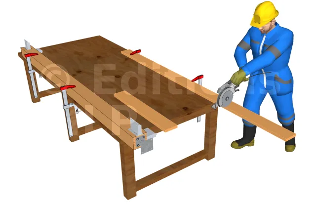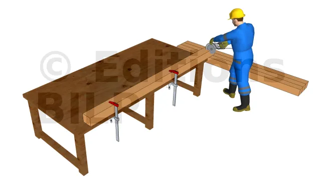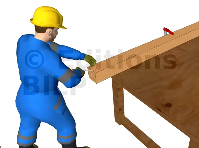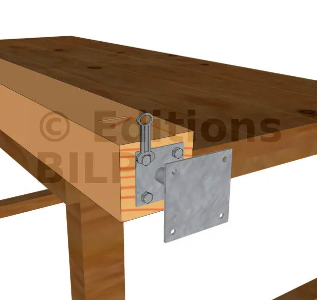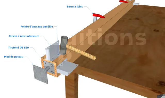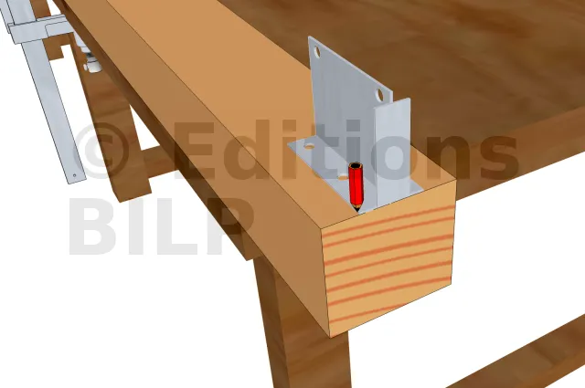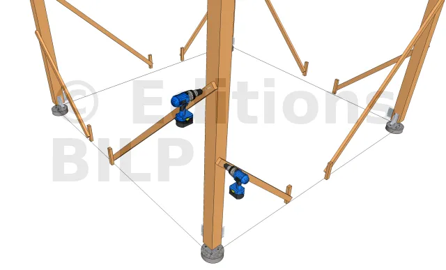 En premier lieu, il faut commencer par lire le plan est les différentes mesures inscrites pour avoir la bonne dimension lors du sciage.Une fois les découpes achevés, prenez le pied de poteau et tracer les trous à percer. Puis, percez le poteau et fixer le pied de poteau avec les tirefonds. Prenez maintenant l’étriers et tracez la partie à enlever pour l’enfourchement. Utilisez un ciseau pour le tailler et aplanissez le fond de l’entaille. Ensuite, poser l’étrier en utilisant des pointes d’ancrage annelé pour sa fixation. Avant de poser les poteaux sur les plots, marquer les emplacement des voiles. Il est à noter que les voiles seront fixées à l’aide de vis HECO-TOPIX CombiConnect. Même si les voiles peuvent être fixées aux poteaux par un assemblage tenon-mortaise, nous n’allons pas opter pour ce type d’assemblage qui est interdit en extérieur. En effet, les risques d’infiltration lors des pluies sont grands, ce qui risque de fragiliser le bois.
