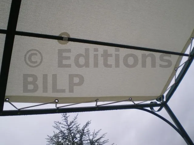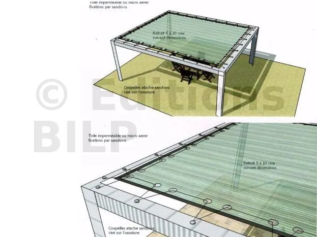 Pour tendre votre toile sur votre pergola, vous n’avez guère d’autre choix que d’utiliser des sandows, sorte d’élastiques très résistants. Les sandows passent dans des œillets sertis sur le bord et au travers de la toile, c’est-à-dire dans l’ourlet, et sont attachés à la structure parfois, on coud une pièce supplémentaire, soit un biais sur toute la longueur, soit un raccord ponctuelle, pour renforcer la toile au niveau de chaque œillet.